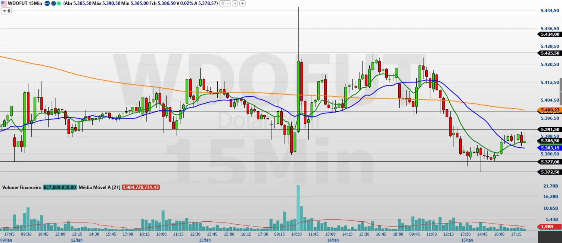 Os contratos futuros de minidólar WDOG26, com vencimento agendado para o mês de fevereiro, encerraram a sessão da última segunda-feira, dia 15 de janeiro, apresentando um recuo de 0,60%, fechando o dia na marca de 5.386,5 pontos. Este movimento marcou a interrupção de uma sequência de valorização da moeda americana, em um pregão caracterizado por uma entrada expressiva de fluxo financeiro para o Brasil e uma notável melhora no apetite global por risco.